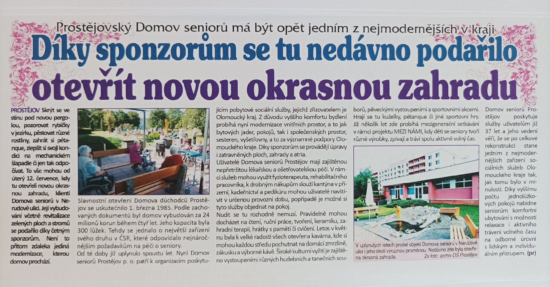 Prostějovský Večerník dnes vydal článek o tom, jaké novinky byly v Domově seniorů Prostějov p.o. díky sponzorům uskutečněny.