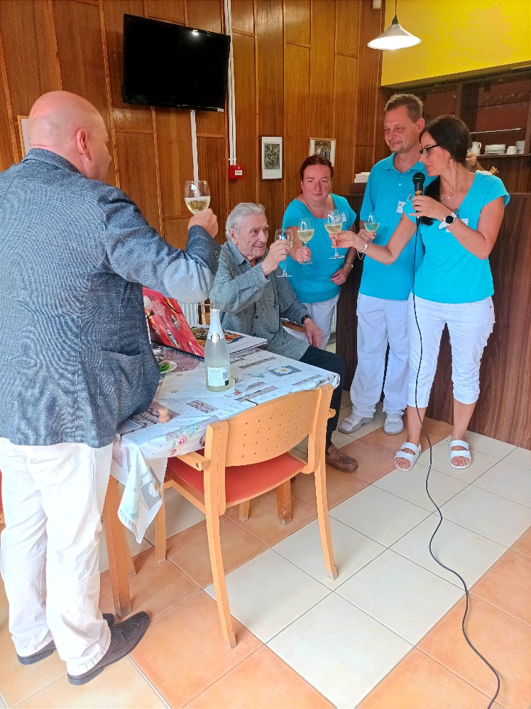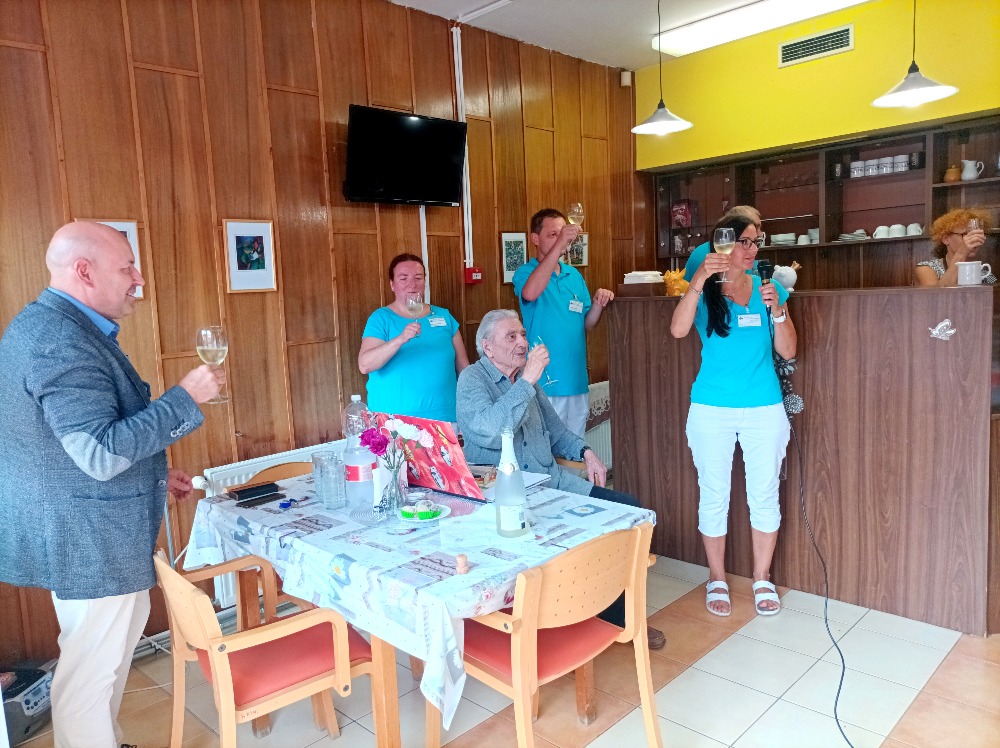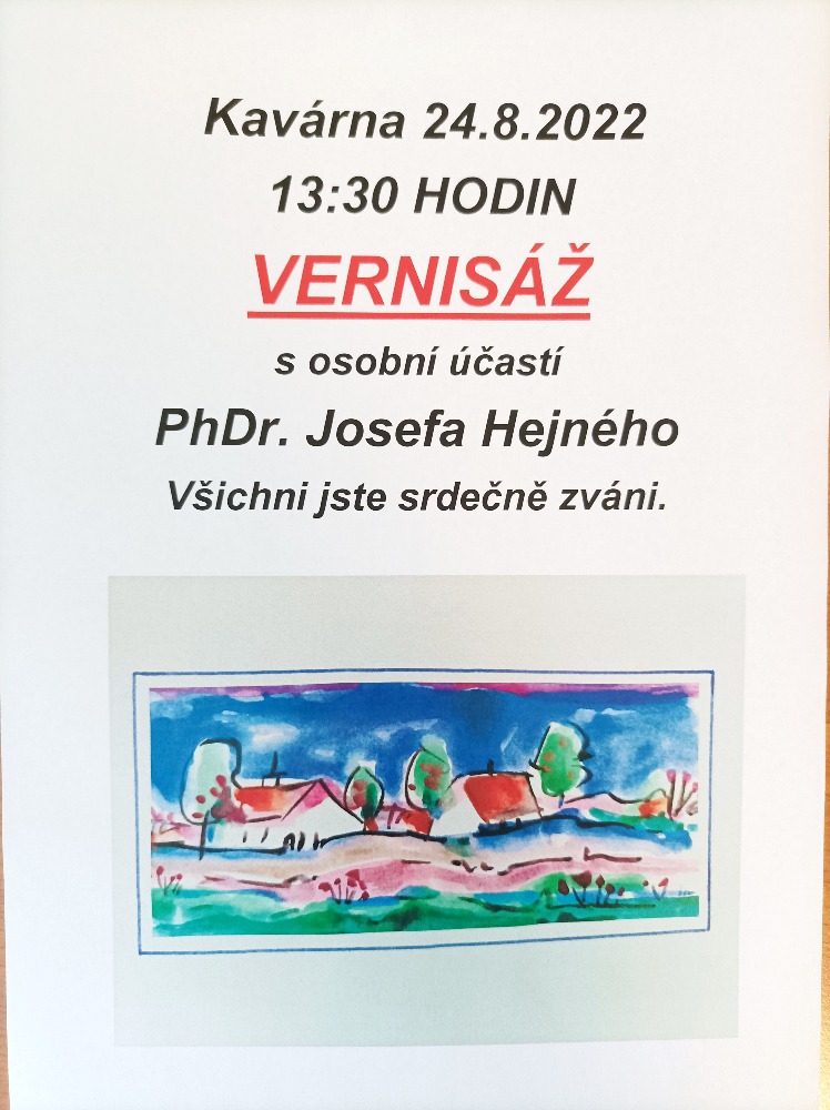 Dne 24.8.2022 se v kavárně našeho zařízení uskutečnila vernisáž pana PhDr. Josefa Hejného - mezinárodně uznávaného pedagoga, umělce a autora mnoha vysokoškolských skript. Bylo nám velkou ctí uspořádat výstavu kopií jeho obrazů, které budou ozdobou našich prostor, k radosti všem stávajícím i budoucím uživatelům. Jeho povídání o jeho pedagogické minulosti bylo velmi zajímavé a poutavé.
