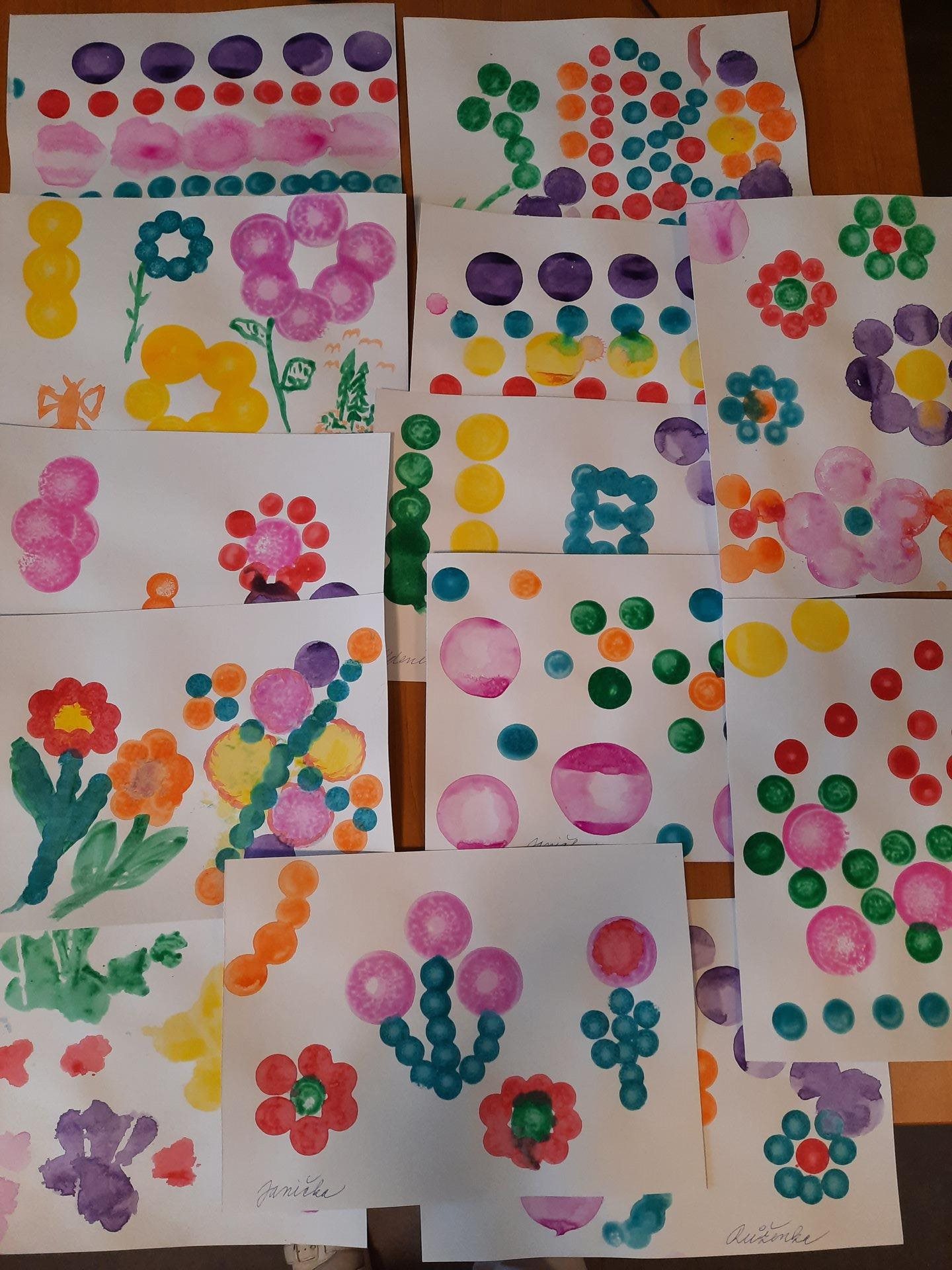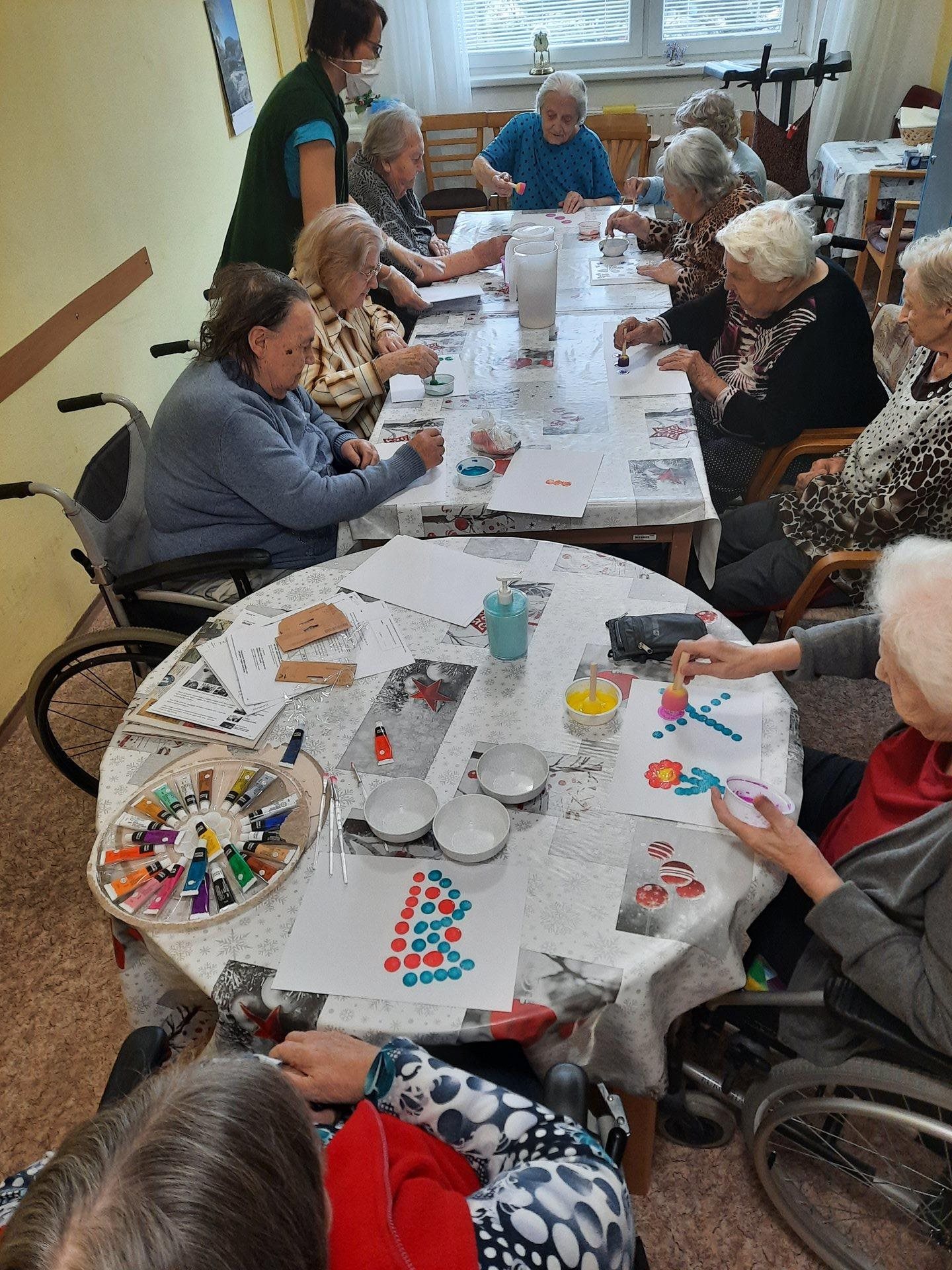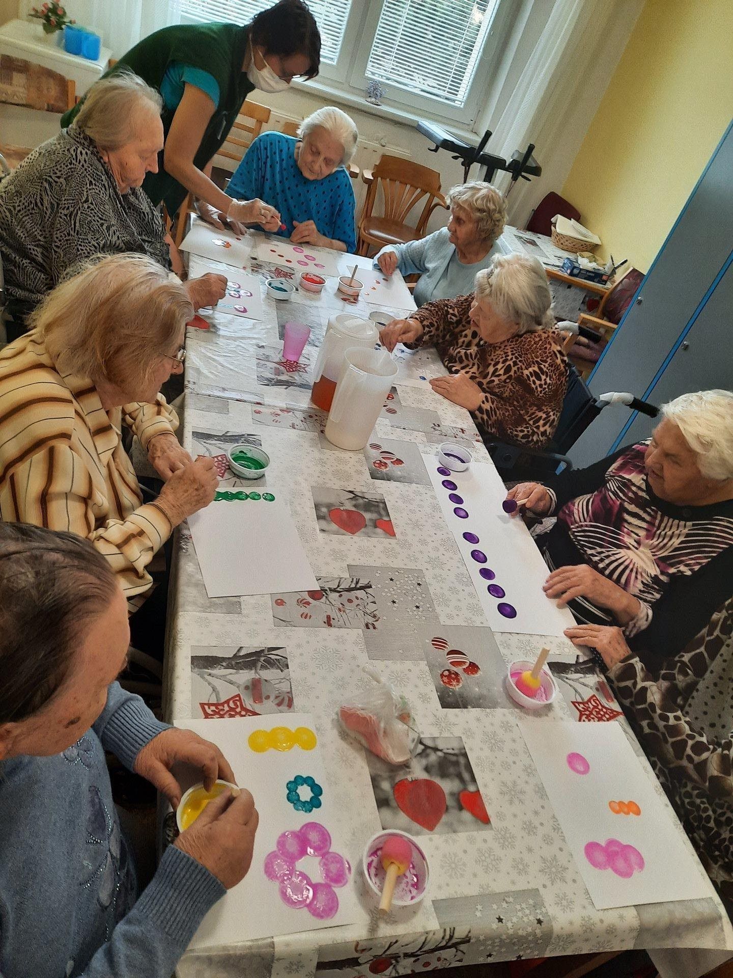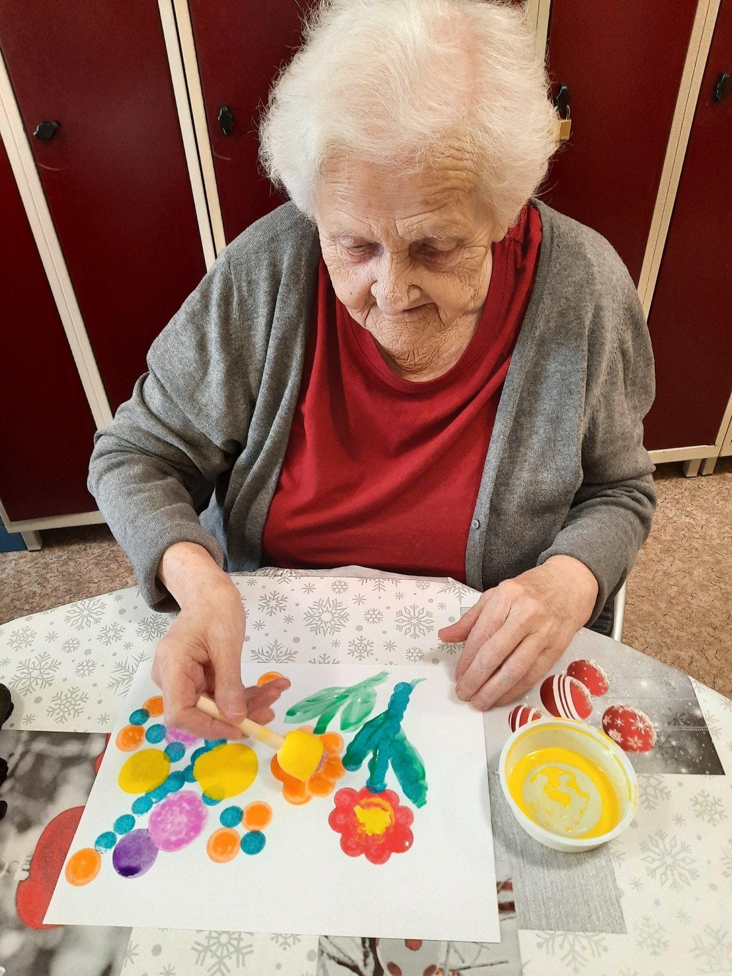Práce s barvami naše seniory velmi baví ,zkoušíme různé techniky a barevné kombinace, uzpůsobené tomu , aby byly zvládnutelné všemi uživateli.