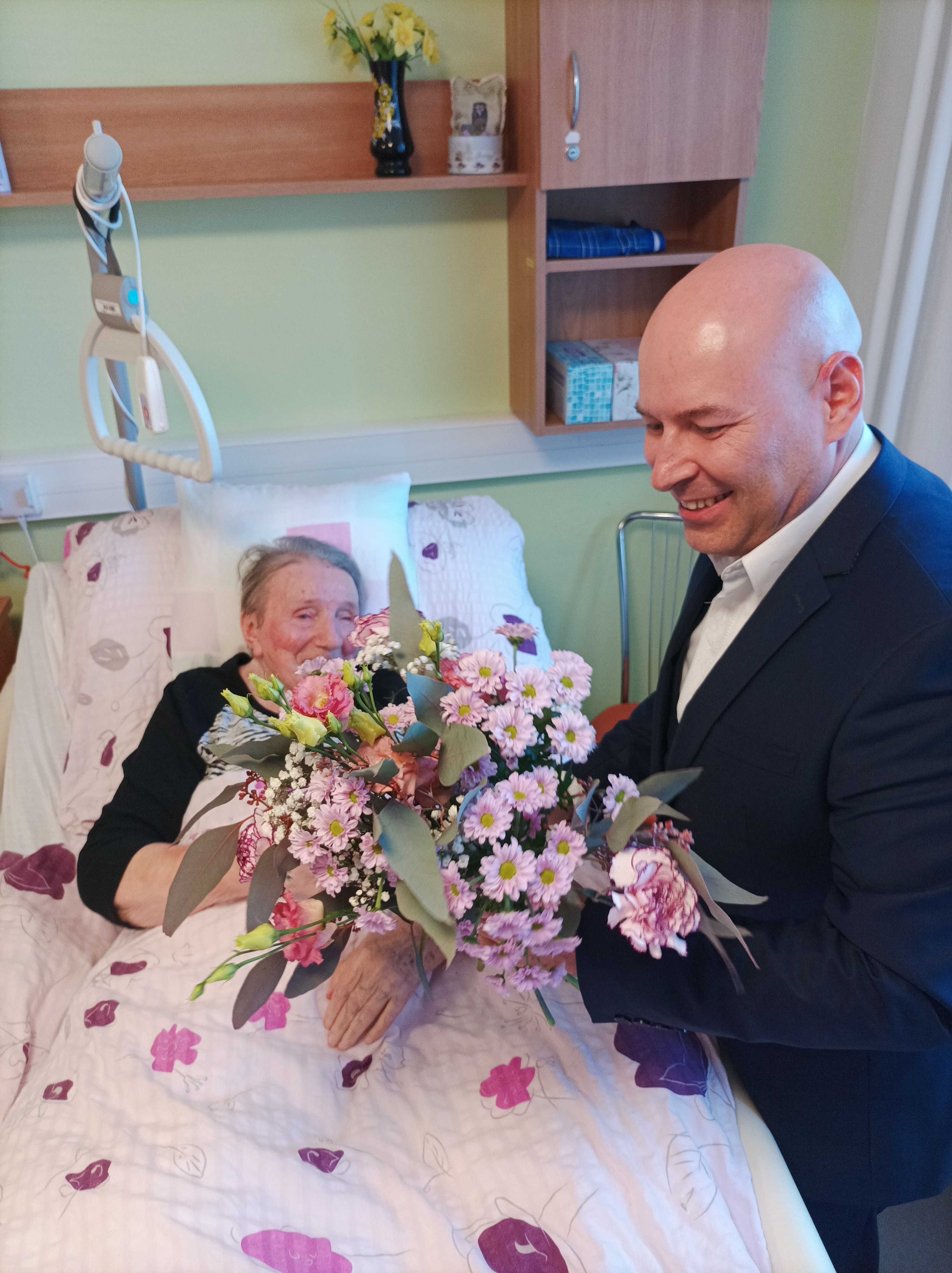Dne 28.9.2023 se uživatelka DS Prostějov p.o. paní L. dožila krásného životního jubilea věku 100.let. 2.10.2023 jí přišel popřát primátor Statutárního města Prostějova pan Mgr. František Jura, ředitel DS Prostějov p.o. pan Mgr.Marek Němec a připojili se i další zaměstnanci. Uživatelce byly předány krásné kytice, dárkový balíček a přání - měla z dárků velkou radost.
