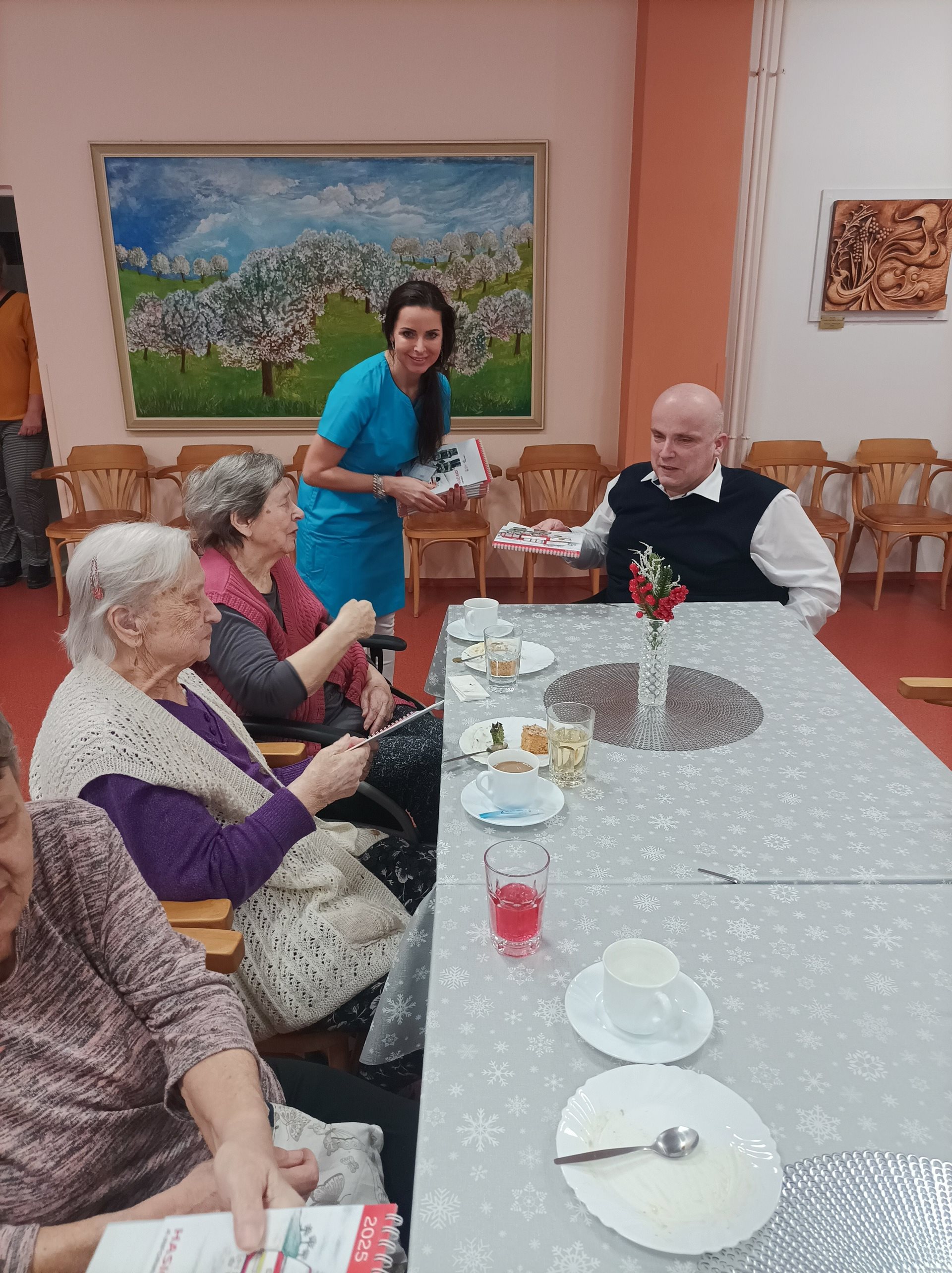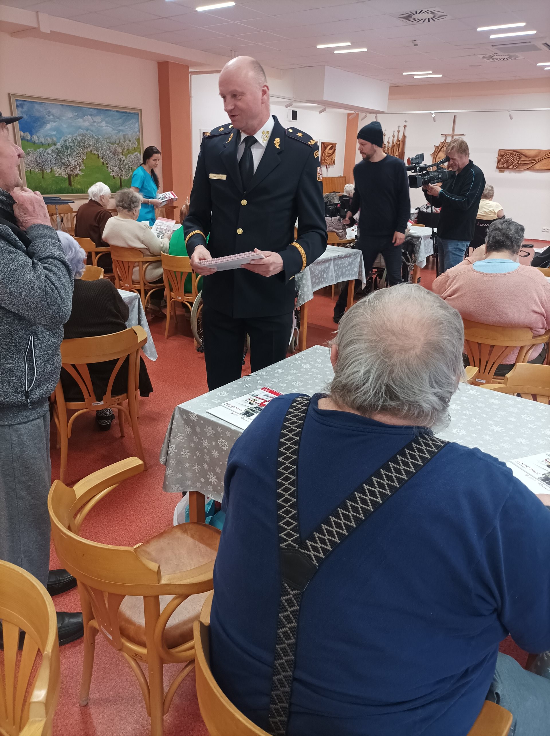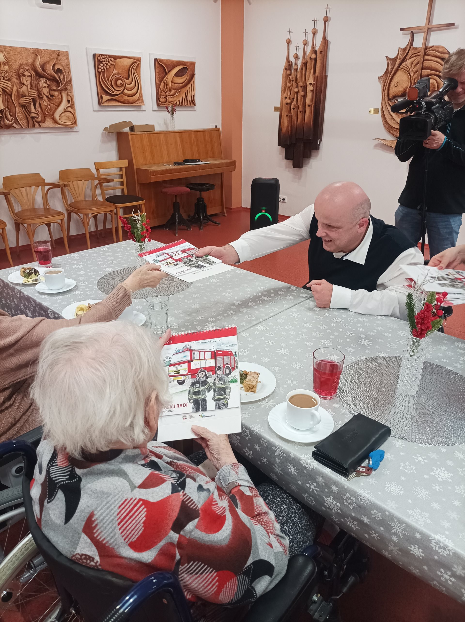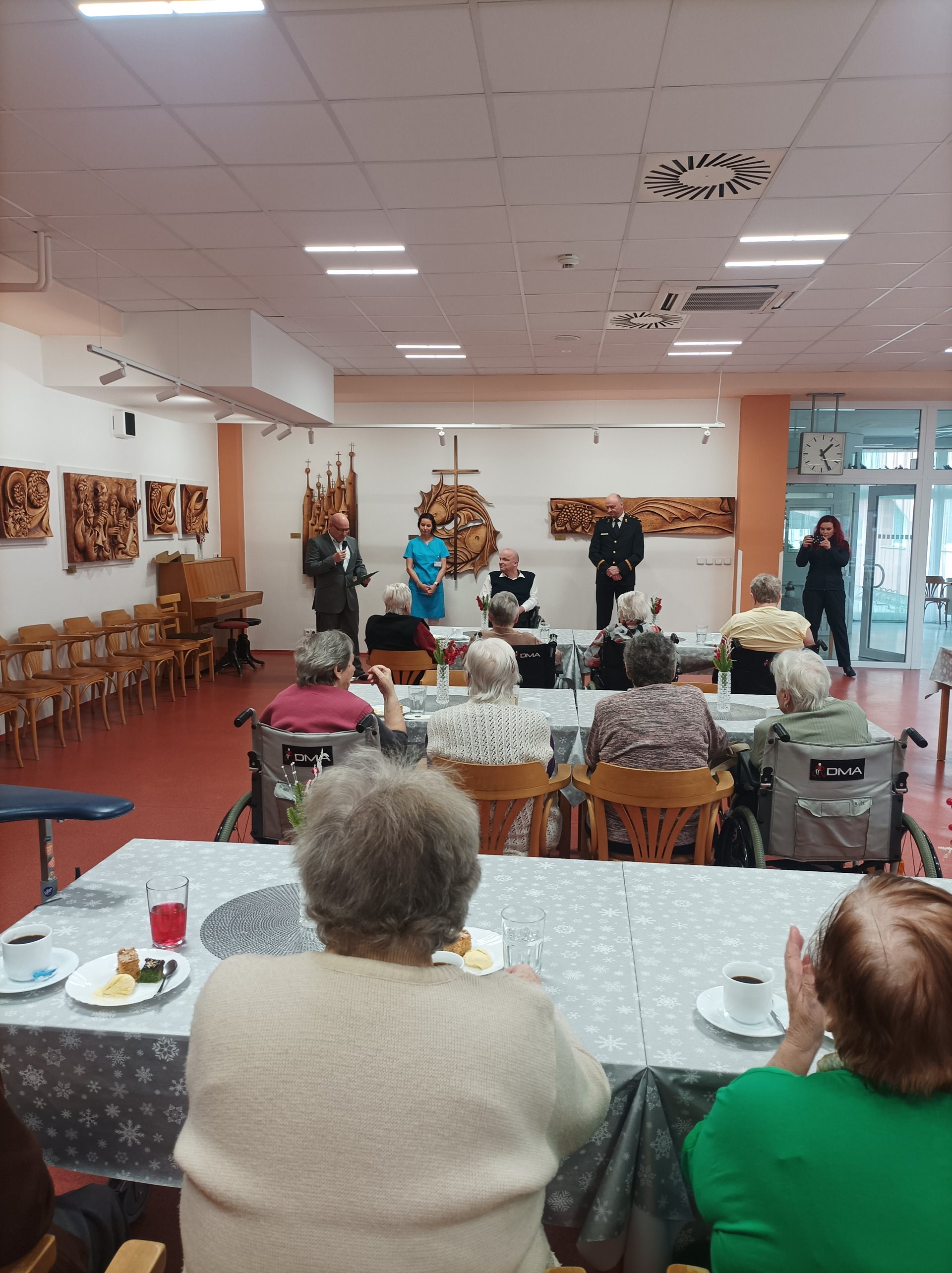 Dne 21. 01. 2025 navštívil Domov seniorů Prostějov p.o. náměstek hejtmana Olomouckého kraje pro sociální věci a záležitosti seniorů JUDr. Martin Škurek, Ph.D. a brigádní generál Ing. Karel Kolářík, ředitel Hasičského záchranného sboru Olomouckého kraje. Po uvítání čestných hostů panem ředitelem Mgr. Markem Němcem, předal pan náměstek JUDr. Martin Škurek, Ph.D. s panem brigádním generálem Ing. Karlem Koláříkem uživatelům krásné stolní kalendáře, popovídali si s nimi u kávy, domácí zmrzliny a zákusku. Poté se věnovali prohlídce Domova seniorů, kterou je provázeli vedoucí pracovníci jednotlivých úseků.